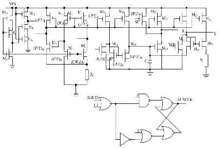 SE为辅助振荡器切换信号,SEB为SE的反信号。当V DD低于1. 9 V时,SE为高电平,M17 , M18都截止,不影响R, S触发器的翻转,辅助振荡器工作,开关S1断开,S2闭合;当VDD高于1. 9 V时,SE为低电平,辅助振荡器关断,开关S1闭合,S2断开,M17、M18都导通,R=1、S= 0、AU XCLK被锁定为高电平,既减小了功耗,也避免了辅助振荡器关断之后R、S端出现不确定状态。